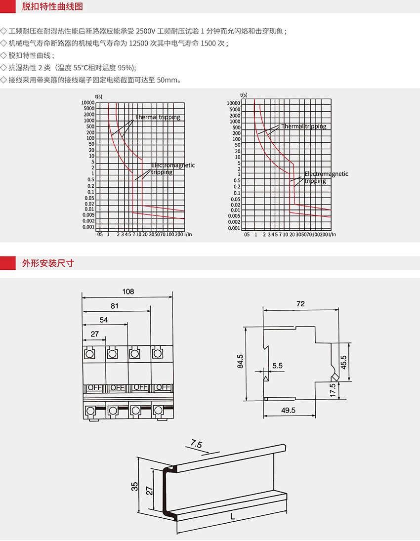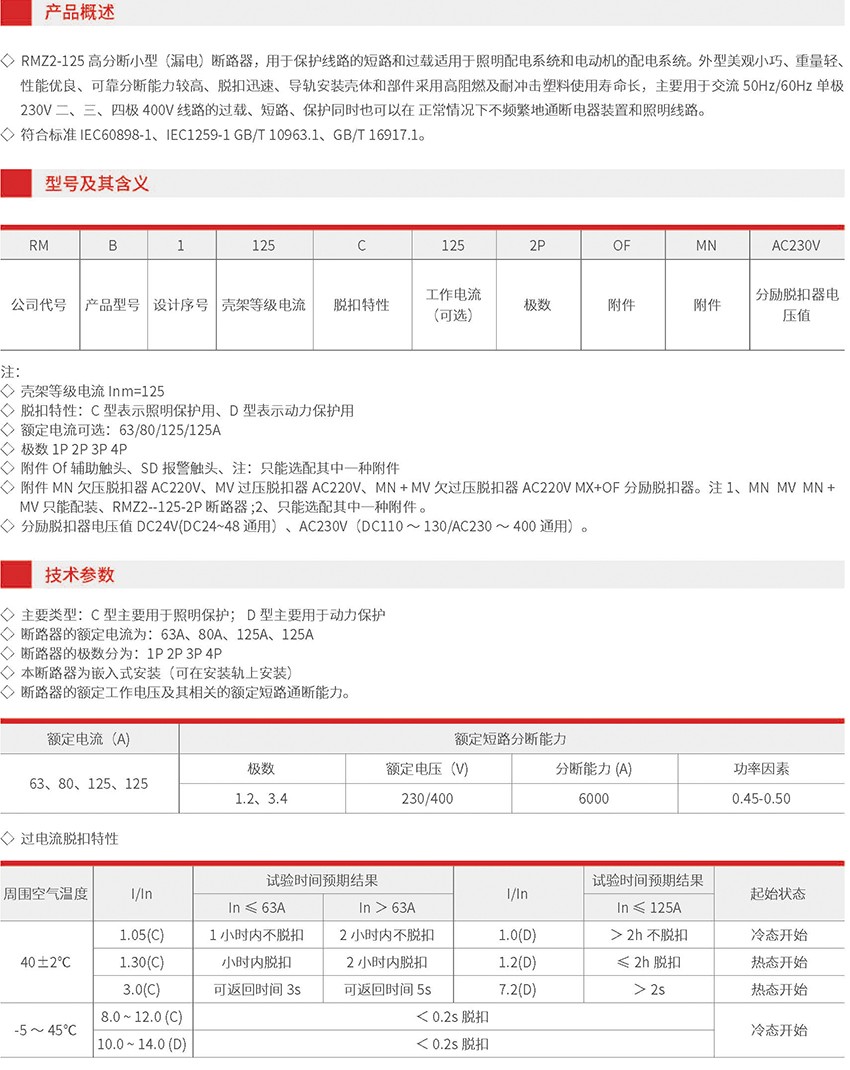 RMZ2-125 高分断小型(漏电)断路器,用于保护线路的短路和过载适用于照明配电系统和电动机的配电系统。外型美观小巧、重量轻、性能优良、可靠分断能力较高、脱扣迅速、导轨安装壳体和部件采用高阻燃及耐冲击塑料使用寿命长,主要用于交流50Hz/60Hz 单极230V 二、三、四极400V 线路的过载、短路、保护同时也可以在 正常情况下不频繁地通断电器装置和照明线路。